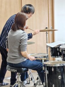 ドラム講師の「がく先生」と一緒に2台のドラムをセットして参加してくださる方を迎えました。