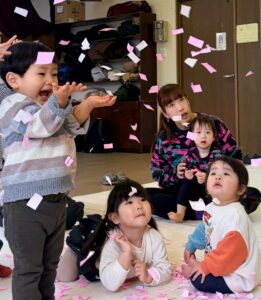 最後は桜の花びらの形に切った折り紙を上から散らす活動。