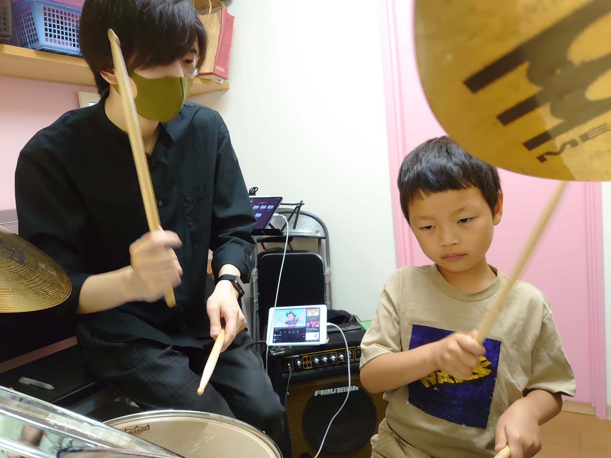家では練習セットや電子ドラムで練習して、教室の本物のドラムセットを叩く、そのリズムでドラム演奏を楽しむことができます。